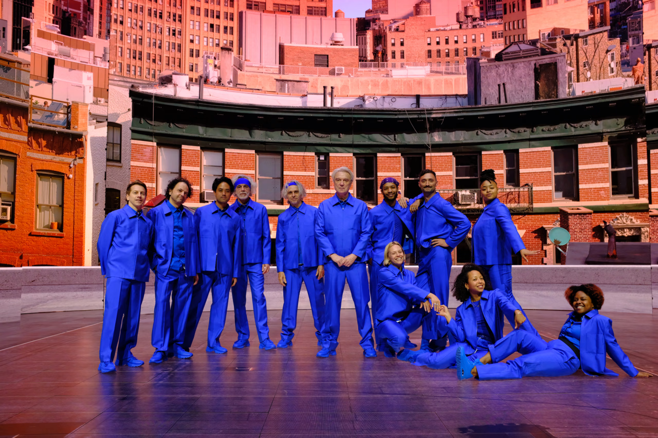 David Byrne posing with the members of his Who Is The Sky touring band during Pennsylvania rehearsals in September 2025.